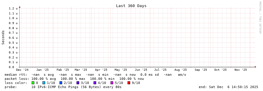 traceroute to fd69:226f:3a3c::2 (fd69:226f:3a3c::2), 30 hops max, 80 byte packets - Generated at 2025-12-06 13:45:01 3 > 4 > 5 > 6 > 7 > 8 > 9 > 10 > 11 > cogent.as174.be.eu (2001:41d0::27ad) [AS16276] 1.332ms !N
