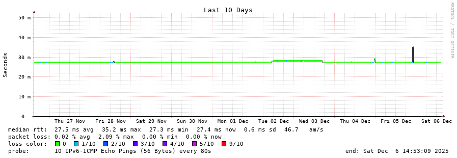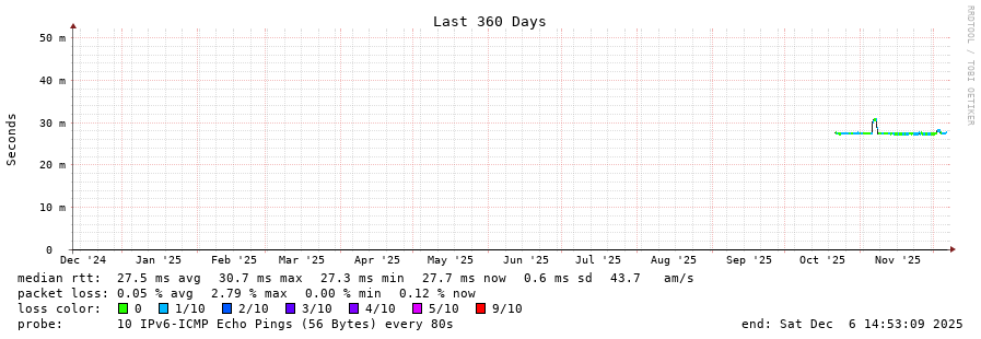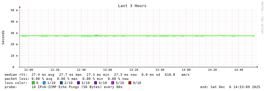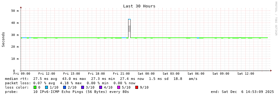 traceroute to 2a00:c30:bbbb:d::2 (2a00:c30:bbbb:d::2), 30 hops max, 80 byte packets - Generated at 2025-12-06 13:45:01